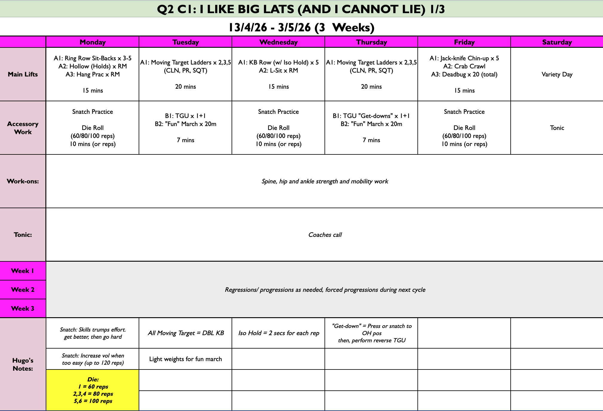 Optimal Training Dose: Chin-ups 👏 love 👏 frequency 👏 . Get to as many M/W/F training days as you can to progress your chin-ups and snatches the most + add in a variety day or KB training day to address general health goals!